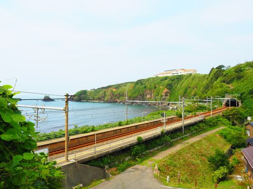 日本海と崖の間にあるホーム。 秘境駅的雰囲気ある青海川駅です^^ もう少し日本海側を映すと、木造りの跨線橋が見えました。 駅らしい雰囲気あるたたずまいでした! 駅舎自身はというと、小さなコンクリート造りの待合室でした。 冬場、風雪にさらされる駅に…