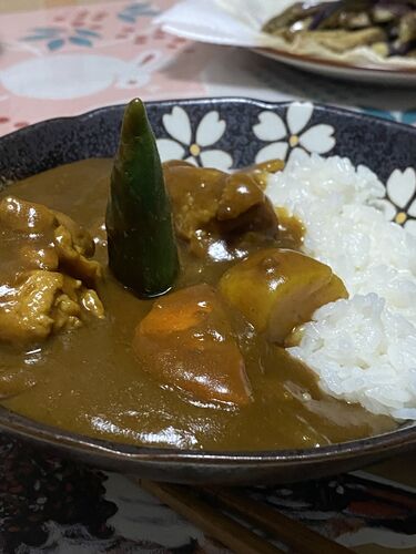 カレー、大人も子供も大好きなメニューですね。 おおっ、これは! 素揚げ/ゆで野菜をトッピング。 最初にオクラを……。 ね、なんか元気なカレーになりました^^