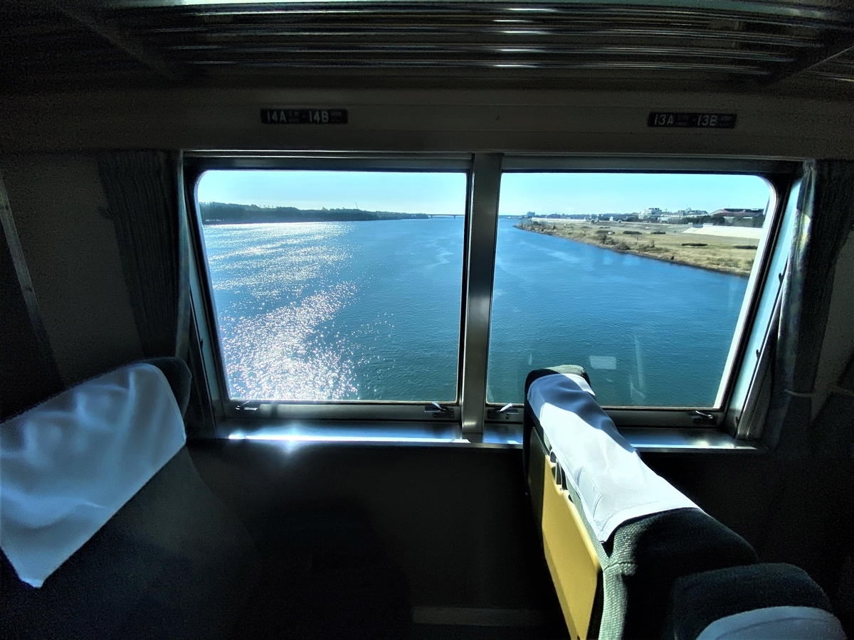 2021-03-13 185系踊り子 修善寺行⑤ 相模川から相模湾へ^^ 鉄旅出会ひとコマ 茅ヶ崎を通過すると神奈川県中央部縦断する相模川か現れます。 車内からの南側車窓からも河口近い川幅たっぷり雰囲気がよくわかります。。 この場所を走行する185系の写真を沢山拝見します。 まさに長大優等列車にピッタリ! その先、今度は車窓北側。 富士山です! 遠くからでも存在感ありますね^^ 小田原を過ぎると、ここから東海道本線海側車窓の見どころへ入ります! まずは、早川。 眩しくてもカーテン全開^^ 駅の早川を過ぎ、山にへばりつくように走る東海道本線。 トンネルを何度か抜けると、大海原出現! キラメク相模湾、185系踊り子からダイナミックな車窓を堪能した時間です^^ 鉄道ランキング