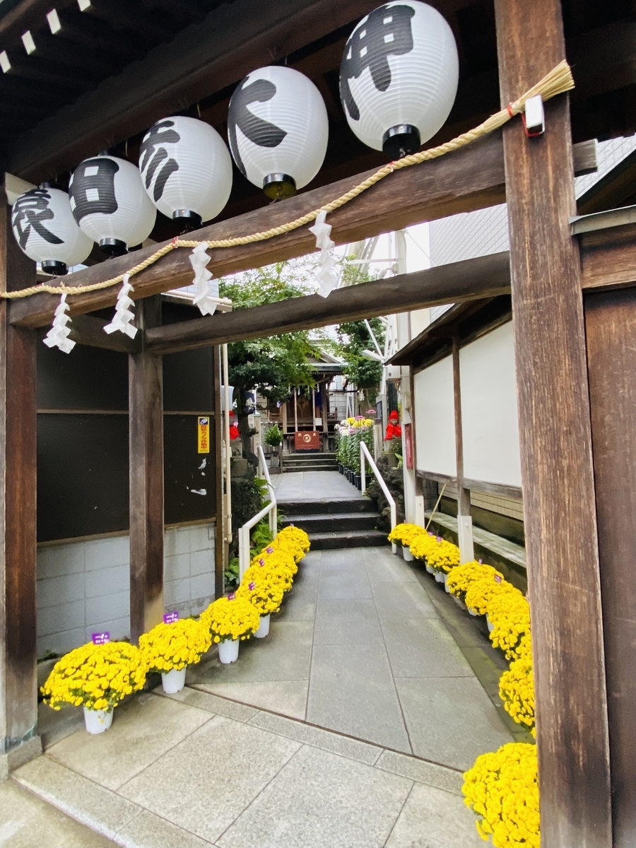 ざる菊が道案内のように配置された境内。